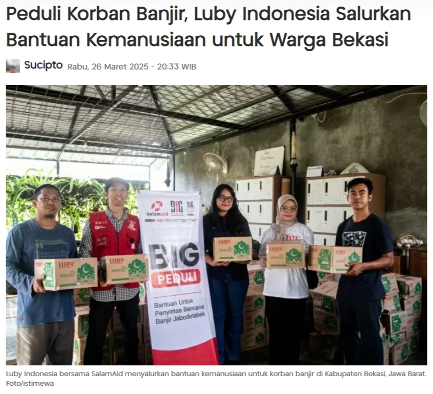 BIG Group – Peduli korban banjir di Kabupaten Bekasi, Jawa Barat, Luby Indonesia bersama SalamAid menyalurkan bantuan kemanusiaan untuk membantu masyarakat terdampak bencana. Bantuan tersebut disalurkan melalui Program Luby Peduli. Seperti diketahui, Maret 2025 wilayah Jawa Barat mengalami bencana banjir.